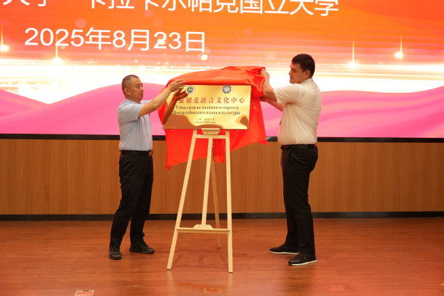 开幕式期间,石河子大学党委书记徐善东与卡拉卡尔帕克国立大学副校长Nurimbetov Timur为乌兹别克语言文化中心揭牌,该中心成为石河子大学对接中亚、深化与中亚国家语言文化及学术交流的又一重要平台。