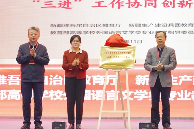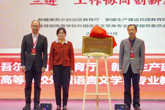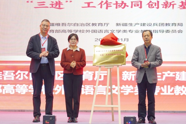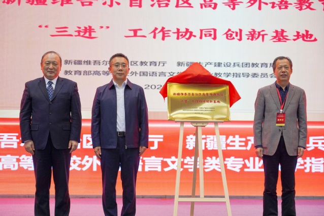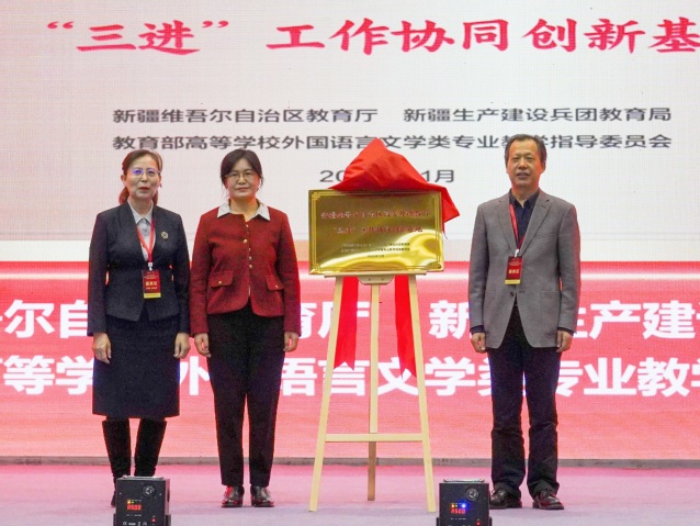 其间,大赛举行了新疆维吾尔自治区高等外语教育“三进”工作协同创新基地授牌仪式。正式授予石河子大学、新疆大学、新疆师范大学、喀什大学、昌吉学院5所高校为新疆高等学校“三进”工作协同创新基地。